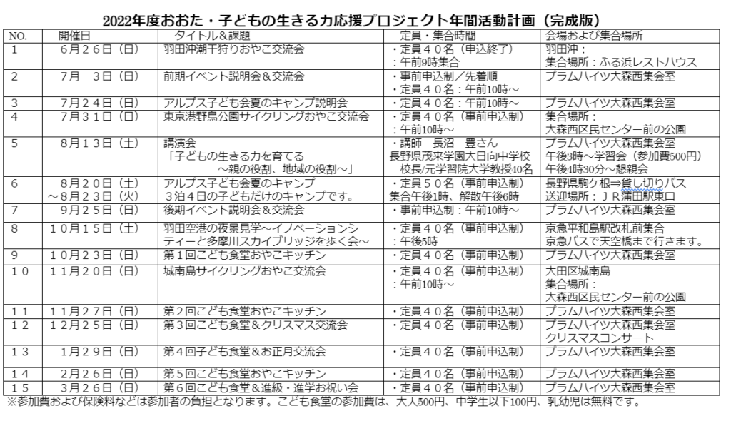 2022年度おおた・子どもの生きる力応援プロジェクトの年間計画